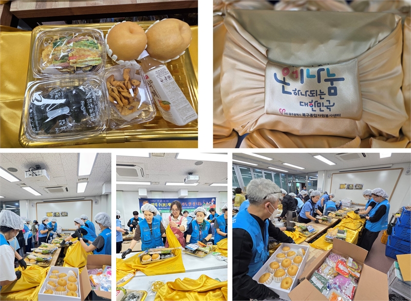 이날 행사에는 27개 동 자원봉사캠프, 자원봉사단체, 1365 개인봉사자 등 약 160명이 참여해 직접 전을 부치고, 과일과 송편, 약과, 김, 식혜, 황태포, 수세미 등으로 정성스럽게 꾸려진 한상차림 꾸러미 400세트를 제작했다. 완성된 꾸러미는 북구 관내 취약계층 세대와 침수 피해 가정에 전달되어, 명절의 따뜻한 정을 함께 나누었다.
