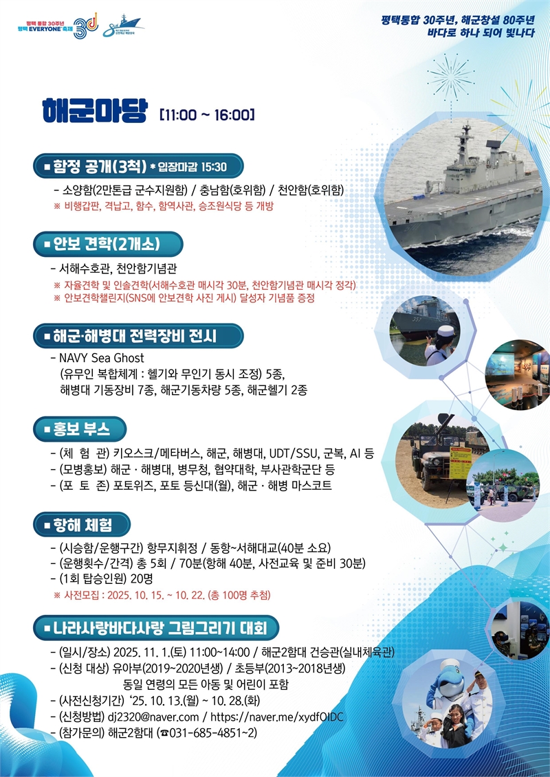 이번 행사는 평택항 통합 30주년과 해군 창설 80주년을 기념해 열리며, ‘바다로 하나 되어 빛나다’를 주제로 시민이 함께 즐기는 해양 문화 축제로 진행된다.