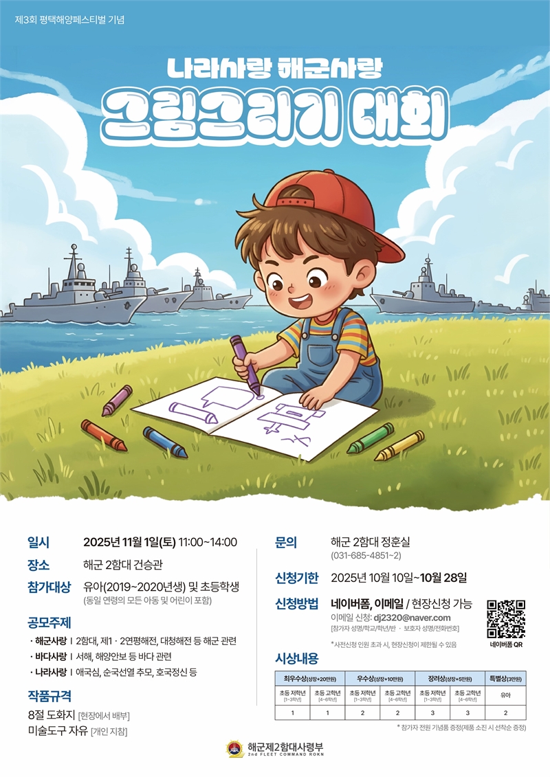 11월 1일 오전 11시부터 해군2함대 건승관에서 진행되며, 신청은 10월 28일까지 온라인 링크를 통해 가능하다.