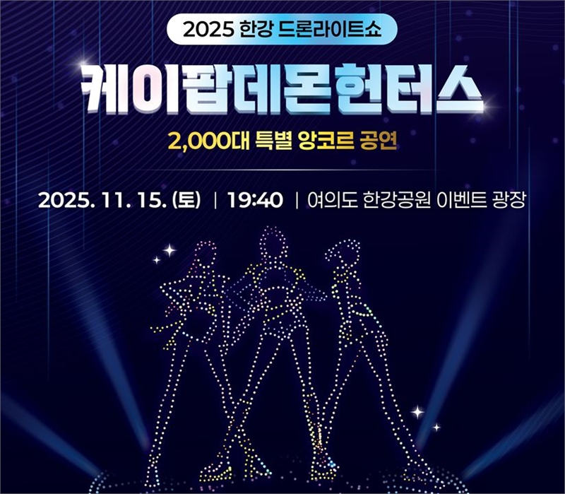 올 한 해 한강의 밤하늘을 ‘케이팝 데몬 헌터스’를 주제로 화려한 드론 불빛으로 수놓으며 시민과 관광객들로부터 큰 사랑을 받은 ‘한강 드론 라이트 쇼’가 15일(토) 저녁 7시 40분, 여의도한강공원에서 마지막 행사를 앙코르 공연으로 장식한다.