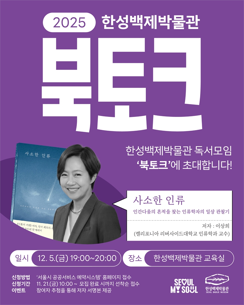 한성백제박물관은 올해 두 차례 운영한 역사독서모임 ‘북토크’를 오는 12월 5일(금)에 추가로 개최한다고 밝혔다. 당초 연 2회 운영했으나 서울 시민들의 많은 호응에 힘입어 추가 편성을 결정한 것이다. 이번 행사는 서울시 대표 야간문화 프로그램 ‘문화로 야금야금(夜金)’의 일환으로, 금요일 밤 박물관에서 역사학·고고학 분야 저자와 시민이 직접 소통할 수 있는 자리로 마련되었다.