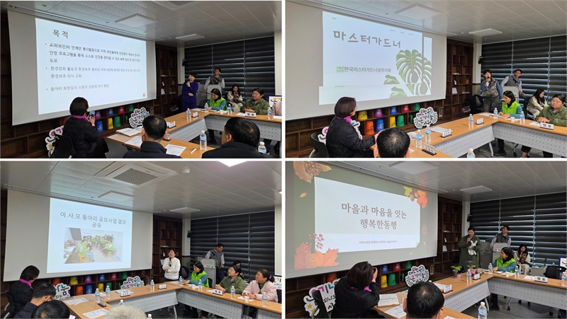 2025년 단체지원 공모사업 성과발표를 하고 있는 각 단체장 자사모, 한국마스터가드너광주지회, 아사모, 행복한 동행 순으로 발표가 진행되었다.