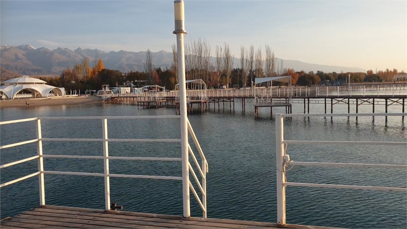 호숫가에는 긴 나무 데크가 호수속으로 안내한다. 뒤로 돌아보니 호숫가를 따라 리조트와 별장들이 즐비하다. 저 너머로 하얀 눈모자를 쓴 텐샨이 웅장함을 뽐내고 있구나!