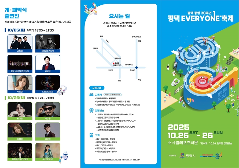 평택시가 통합 30주년을 맞아 시민 모두가 함께 즐길 수 있는 대규모 시민축제 ‘평택 EVERYONE 축제’를 오는 10월 25일(토)부터 26일(일)까지 소사벌레포츠타운 일원(평남로 616)에서 개최한다.1995년 평택시와 송탄시, 평택군이 하나로 통합되어 지금의 평택시가 탄생한 지 30년이 되는 해를 기념하는 이번 축