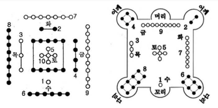 1은 1에 5를 얻어 1・6 수(水)가 되고 북(北)에, 2는 2에 5를 얻어 2・7 화(火)가 되며 남(南)에, 3은 3에 5를 얻어 3・8 목(木)이 되고 동(東)에, 4는 4에 5를 얻어 4・9 금(金)이 되며 서(西)에, 5는 5에 5를 얻어 5・10 토(土)가 되어 중앙(中央)에 각각 자리한다.