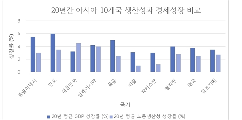 (3) 인도와 방글라데시는 높은 경제 성장률을 기록했으나, 생산성 향상 폭은 상대적으로 제한적이었다. 방글라데시는 연평균 GDP 성장률 5.5%를 기록하며 남아시아의 경제 성장 엔진으로 자리매김했지만, 노동생산성 성장률은 3.0%로, 성장의 상당 부분이 인구·노동력 확대와 산업 규모 확장에 의존했다. 인도는 GDP 성장률 6.0%와 노동생산성 3.5%로, ‘디지털 인디아(Digital India)’ 정책과 Aadhaar기반 인증과 전자금융시스템 구축, 모바일 기반 서비스 확산을 통해 행정 효율성을 높였으나, 광범위한 비공식 경제 부문과 지역별 인프라 격차가 생산성 개선 속도를 제약했다고 나타났다.