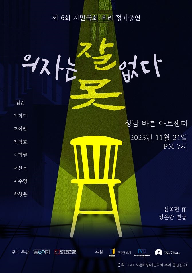 인간의 끝없는 소유욕을 예리하게 해부하는 블랙코미디 연극〈의자는 잘못없다〉가 오는 11월 21일(금) 오후 7시, 성남바른아트센터에서 막을 올린다. 이번 작품은 시민극회 ‘우리’가 기획했으며, 작가 선욱현의 탄탄한 극본과 연출 정은란의 섬세한 감각이 함께 어우러져 인간 내면의 욕망을 풍자적으로 풀어낼 예정이다.