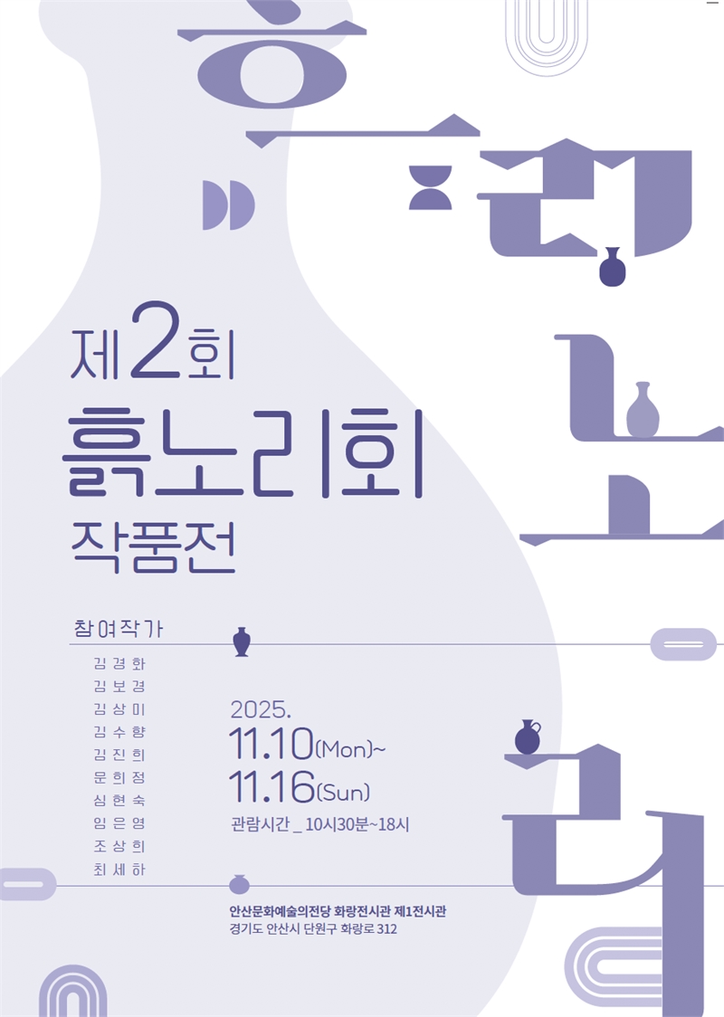 안산 지역 도예 작가 모임 흙노리회가 제2회 작품전을 개최한다. 이번 전시는 11월 10일부터 16일까지 안산문화예술의전당 화랑전시관 제1전시관에서 열리며, 지난해 11월 창립전에 이은 두 번째 전시다.