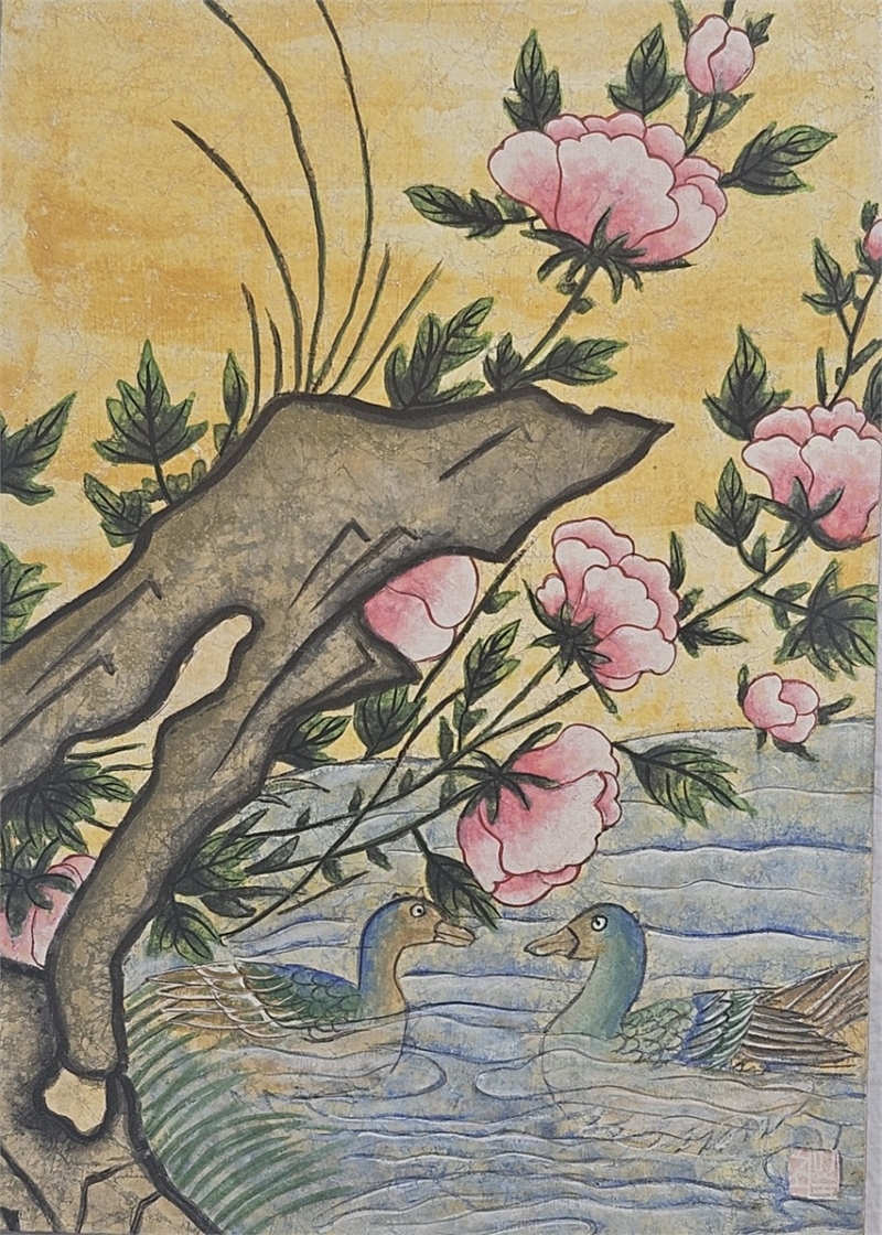 최미숙 작가의 '화조도'는 바위 위에 핀 분홍빛 꽃 가지 사이로 서로를 바라보는 두 마리 새의 모습에서 일상의 소박한 행복이 읽힌다. 전통 화조도의 길상적 의미를 현대적 감성으로 풀어냈다.