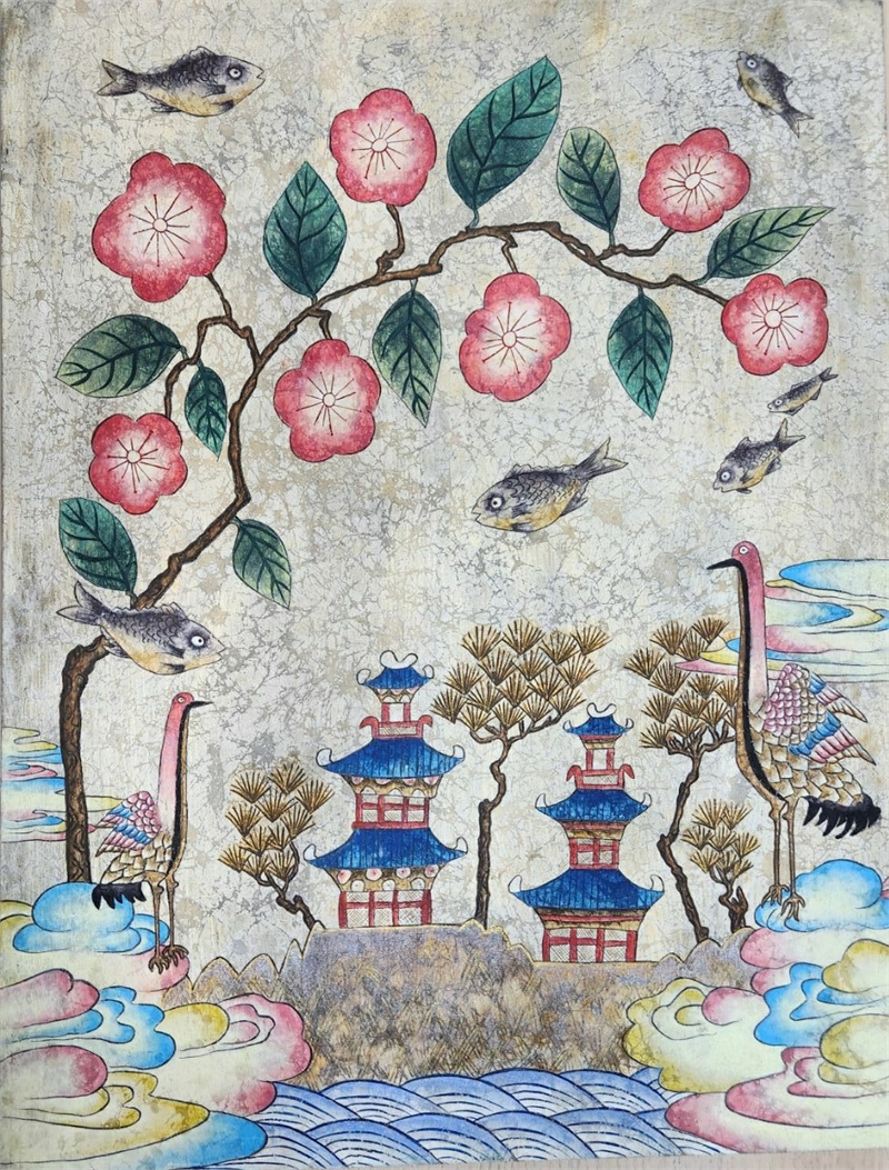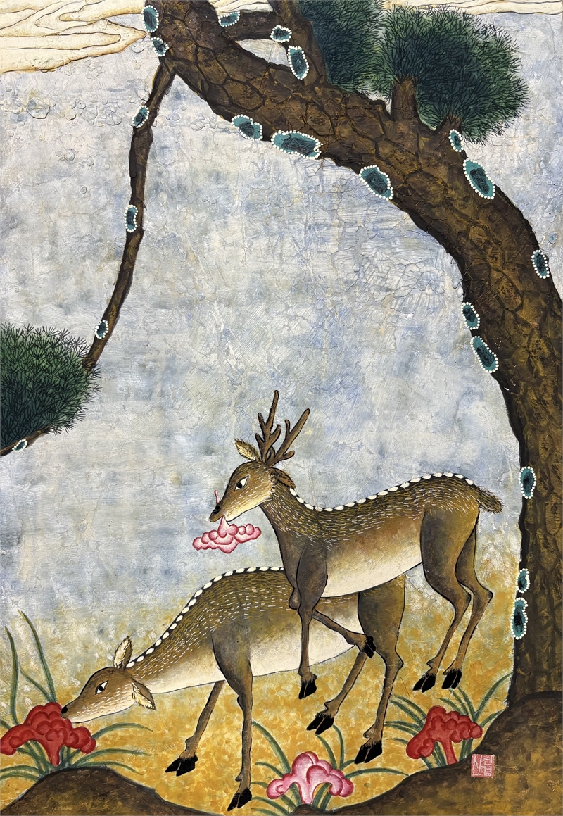 신언경 작가는 '장생도'에서 사슴과 소나무, 불로초 등 장수를 상징하는 전통 소재를 담았다. 은은한 색채 표현으로 현대적 감각을 더해 고즈넉한 미감을 살렸다.